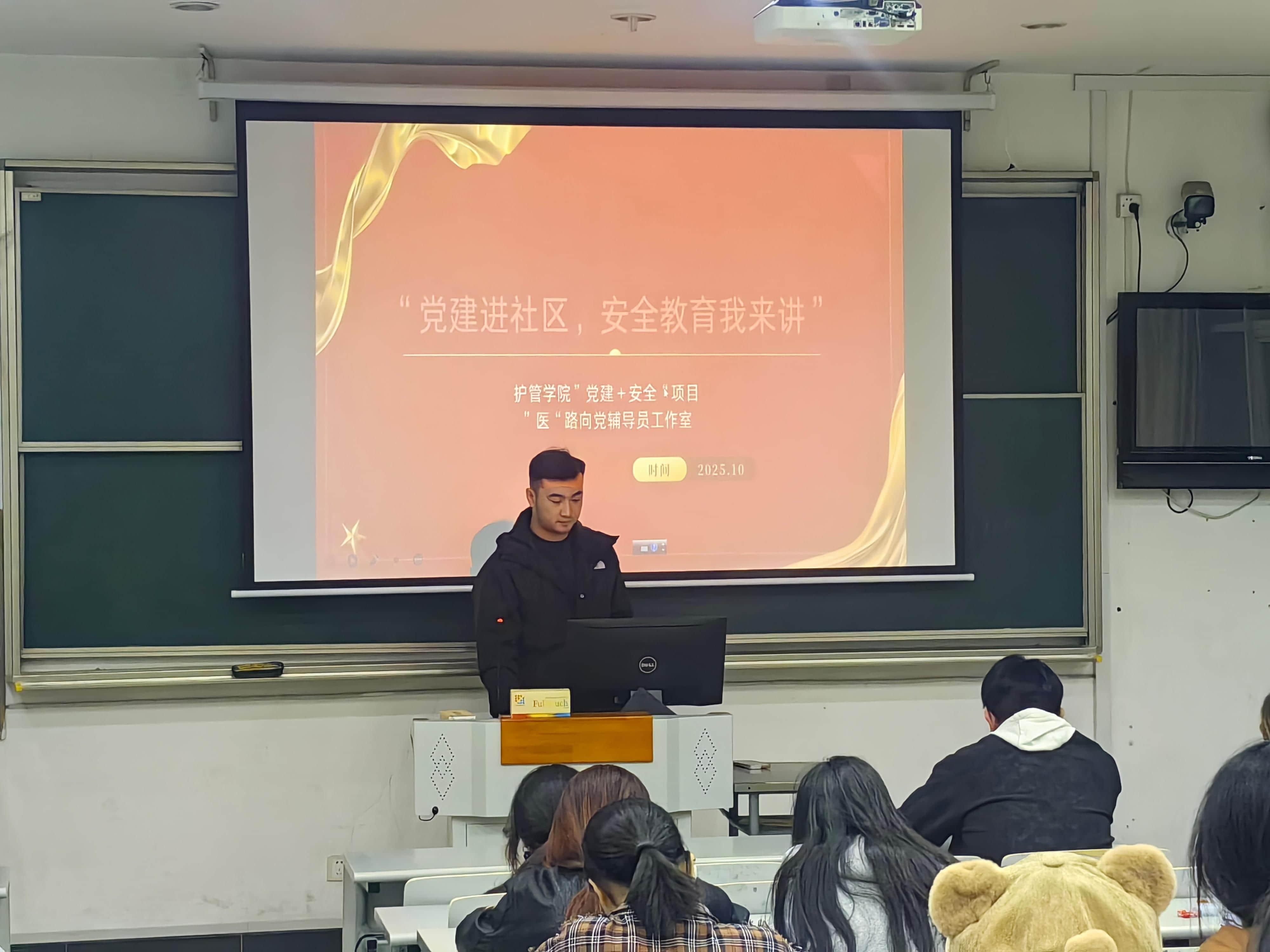 冬季来临,学生宿舍内各类电器使用频繁,安全风险随之升高。为切实增强学生安全防范意识,提升应急处置能力,营造安全稳定的校园环境,10月29日晚上,上海健康医学院学生社区党员工作站联合“医”路向党辅导员工作室、护管学院“护”安社区行“党建+安全”项目团队,在北苑6号楼101室开展“大学生安全教育”宣讲活动。本次讲座由25级健康服务与管理(专升本)班退伍士兵、学生党员孟子翔和衣鸣霄两位同学主讲,围绕安全意识树立、风险识别防范、突发事件应对及安全教育路径等维度展开系统讲解,旨在推动安全理念深入人心、安全行为成为习惯。