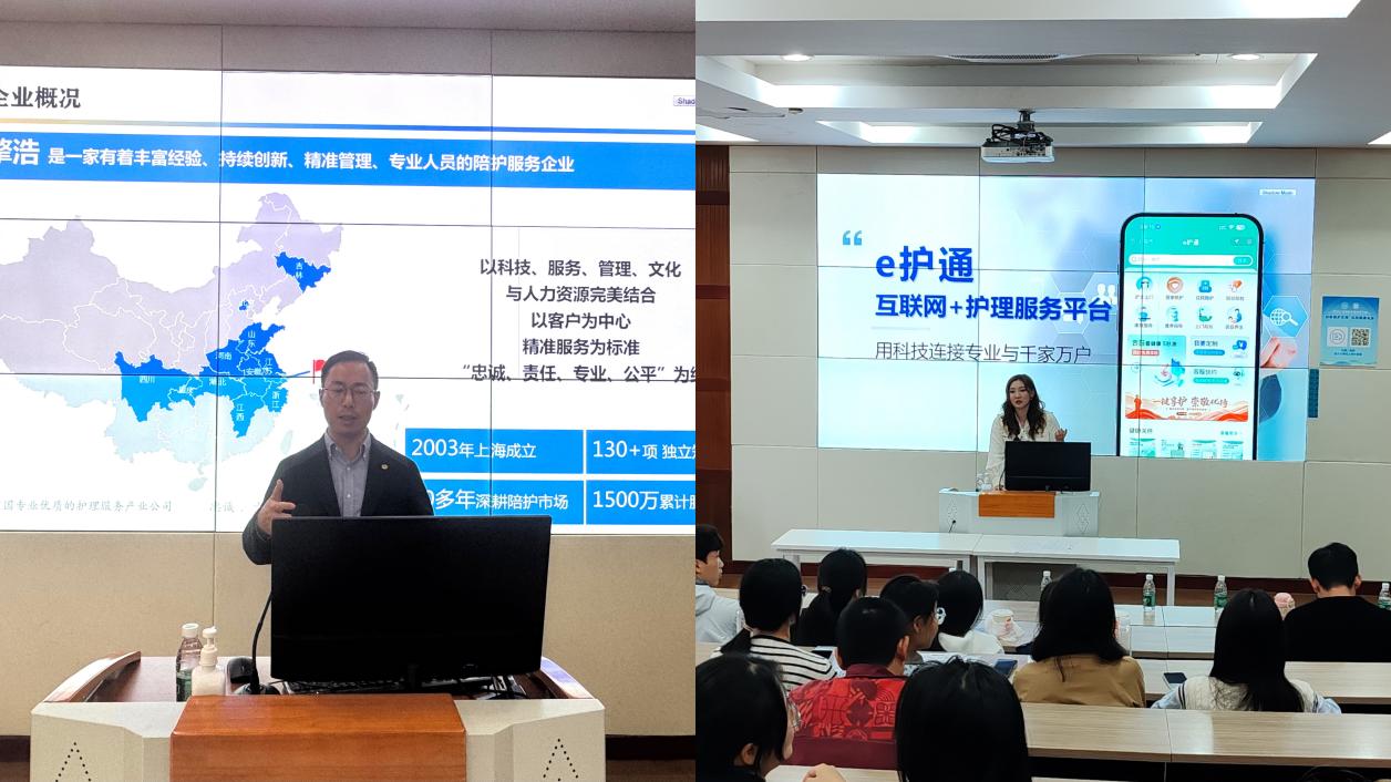 随后,上海擎浩医院管理有限公司代表张帆与人事部金师师依次登台,就企业概况与招聘岗位进行宣讲。其中,医疗护理员(储备干部)岗位计划招聘20人,其清晰的职业发展路径——从一线护理可晋升至管理员、项目经理等管理岗位,引发了同学们的广泛关注。接着,金师师进一步介绍了上海摩易信息科技发展有限公司旗下的“e护通”平台,重点阐释了其“互联网+护理服务”的创新模式与社区护理战略布局。现场发布的50个平台项目运营实习生岗位,迅速点燃了同学们的参与热情。一系列内容扎实的分享,使同学们对行业前沿、企业生态及具体职业机会形成了更为全面的认知。