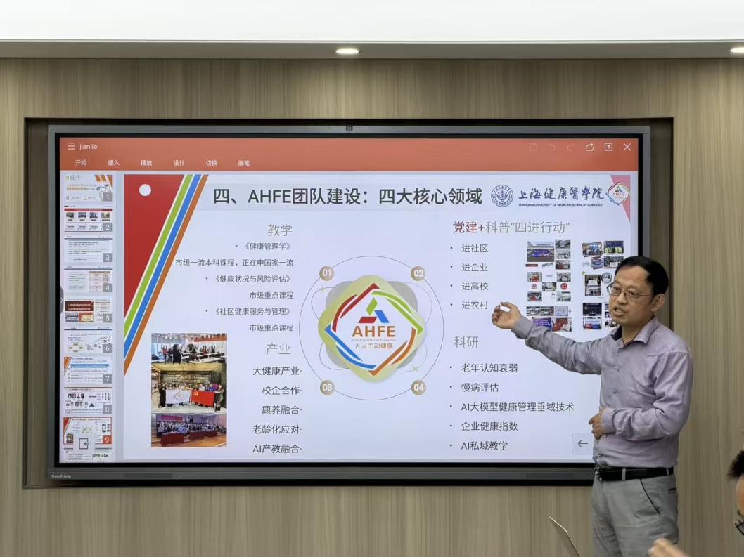 上海交通大学出版社党委副书记戴智华教授及医学分社副社长郑月林对上海健康医学院AHFE团队的到访表示热烈欢迎,并详细介绍了出版社在医学健康、科学技术、人文社科等领域的出版成果、资源优势以及融合发展策略。出版社方面表示,作为知识传播和文化建设的重要阵地,始终关注国民健康领域,愿意发挥自身在内容策划、专家资源、渠道建设和品牌影响力方面的优势。戴智华书记表示,与上海健康医学院AHFE平台这样的创新型团队携手,在党建引领下,共同探讨联合策划系列主动健康社区科普丛书、数字化专著和教材等出版物和主动健康素养等皮书系列的可能性,内容涵盖中医养生、营养运动、心理健康、城市流动人口健康、职场健康、药事管理等多个维度,并探索在健康知识服务、社区健康促进等更广阔领域的合作可能性。通过双方进行党建联建和战略合作,扩大双方在健康领域的社会影响力,共同塑造人人主动健康的文化传播氛围。