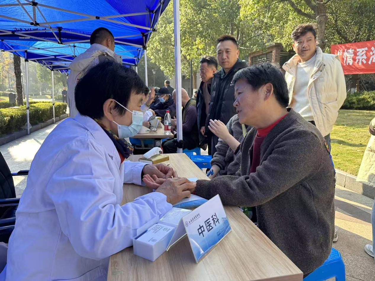 活动现场,来自两个党支部的党员志愿者们亮身份、树旗帜,迅速搭建起有序的服务阵地。教工第一党支部10名党员志愿者主动靠前,与体育教学部直属党支部的同志们分工协作,为前来咨询的居民提供全方位健康服务。中医科医生凭借专业功底,通过望、闻、问、切精准辨证,为居民量身定制中药调理方案,同时细致讲解冬季养生知识、饮食禁忌与日常保健要点;推拿科医师则聚焦颈肩腰腿痛等常见问题,运用专业按摩手法为居民现场缓解不适,手把手传授简单易学的保健动作,帮助大家在家就能开展自我护理。此外,活动还设置了基础检查区与科普宣传区,志愿者们为居民免费测量血压、检测血糖,详细记录健康数据,针对高血压、糖尿病等常见慢性病进行健康科普,耐心解答居民关于疾病预防、康复护理的各类疑问,引导大家树立科学健康的生活理念。