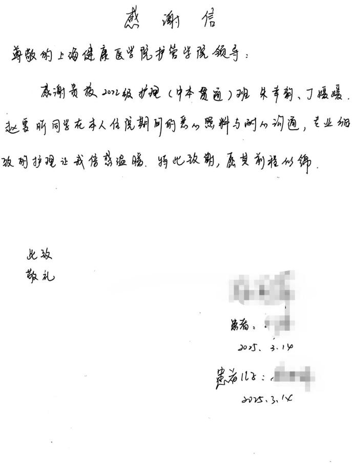 近日,上海交通大学医学院附属新华医院脊柱中心二病区收到一封由患者与同病房多位病友联名撰写的感谢信,高度赞扬我校2022级护理学(中本贯通)班实习生朱幸韵、丁媛媛和赵雯昕的卓越护理服务。