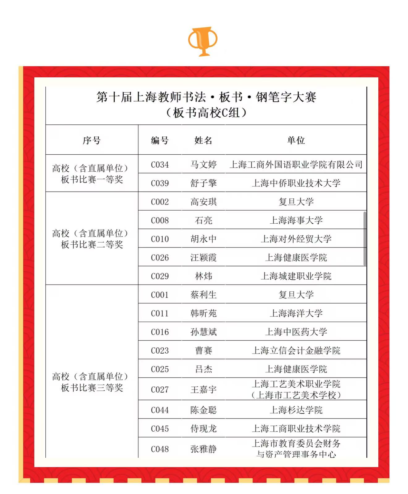 本次大赛作为上海市教育系统的重要品牌赛事,旨在锤炼教师教学基本功,弘扬中华优秀传统文化,全面展现新时代上海教师的专业素养与育人风采。来自全市教育系统近400名教师参与了书法、板书、钢笔字三大项目的技艺切磋。汪颖霞老师在板书比赛中熟练运笔、从容布局,以其规范工整、结构清晰的板书作品,赢得了评委的一致好评,充分展现了我院教师扎实的教学基本功与良好的职业素养。