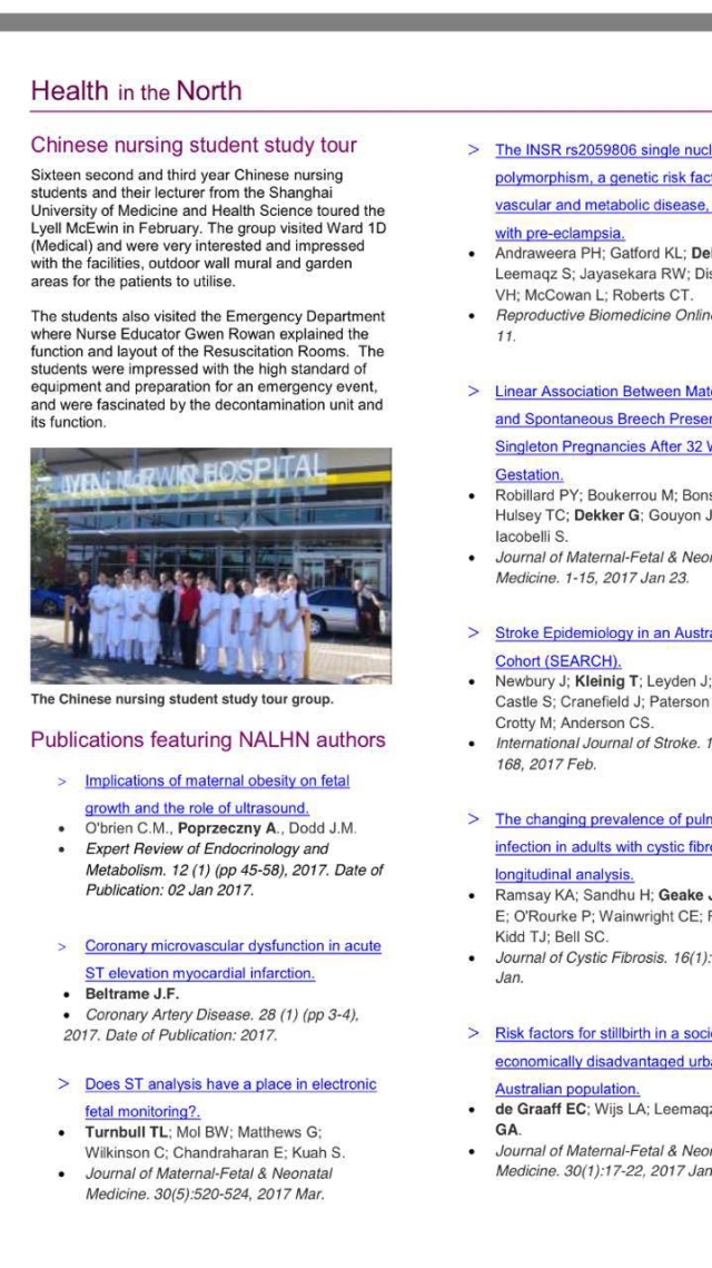 学生们成为3D网络虚拟课程的首次体验用户,模拟了临床上的各种护理操作,采用人机对话的形式讲解课程并以颁发证书的形式检验成果,让人身临其境的3D效果增强了学生的自学能力。通过与全英语的理论授课:护理伦理与法规、母婴护理、基础护理等相结合,让学生们很快便掌握了这些课程知识。母婴护理课上,Valerie老师还请来了尚在哺乳期的Vivian学姐和她的宝宝加入了课堂交流,通过边观察孩子的神情和动作边实践教学,展示了婴幼儿的一些习性,如见到陌生人的反应和怎样和孩子沟通等,让学生们倍感新鲜。实践课分为临床实践和实训室实践,学校每周安排学生们参观LYELLMcEWIN医院、伊丽莎白女皇医院医院、VITA养老中心、独立生活中心等,本次游学团参观LYELLMcEWIN医院的活动,还得到了当地媒体的关注,在《Health in the North》报纸上发布了相关报道。每周1-2次参观感想通过小组PPT展示汇报,高强度的训练给学生带来的是英语的飞速提高和见闻的飞速扩展。
