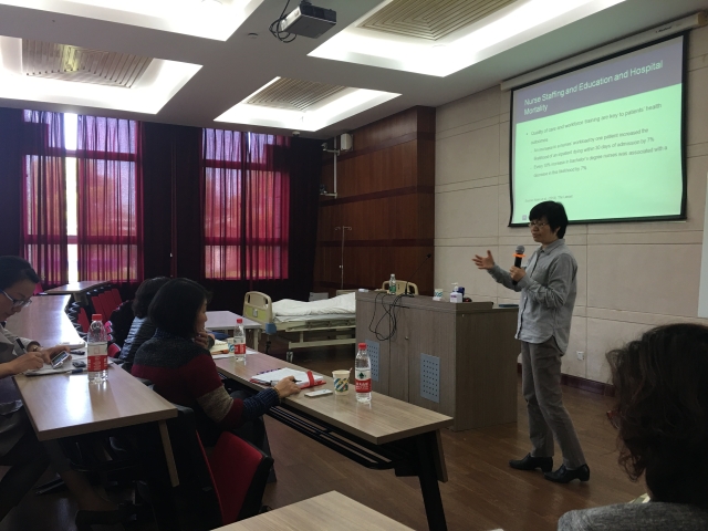 此次参加学术沙龙活动的不仅有护理学院全体专任教师,同时也有上海健康医学院附属周浦医院科研骨干以及与护理学院有合作项目的社区工作者。吴蓓教授以获取美国国立卫生研究院(简称NIH)资金资助为例,详细而生动为我们讲解介绍了在各类科研课题项目申报过程中的关键要点,通过自己的工作经验解读了NIH项目的评审流程和标准,指出在项目申报时,需要多学科团队合作,选题要紧跟最新研究热点,课题设计要科学规范,科研方法正确、同时符合伦理学要求。同时吴蓓教授就目前NIH最新研究和资助方向给我们进行了详细的介绍:包括症状学管理、健康促进、自我管理、临终关怀,同时结合护理学院的老年社区研究中心的研究方向给予了具体的指导,建议将研究中心建立成一个开放平台,并且协同上海市其它健康社区或老年研究团队机构合作,在养老机构护理质量、老年护理正式照顾者的培养及非正式照顾者的培训、慢性病管理轨迹调研、以及如何信息化技术进行大数据开发利用等方面进行深度研究。她认为我们不仅要对专业人员提供大数据信息,同时应该让慢病病人与家属了解相关大数据信息,从而让病人与家属一起共同参与干预措施的制订,从而真正落实对病人的精准护理。讲座结束后,老师们与吴蓓教授进行深入讨论,对今后自己的科研方向更加明确,对课题申报也更有思路。