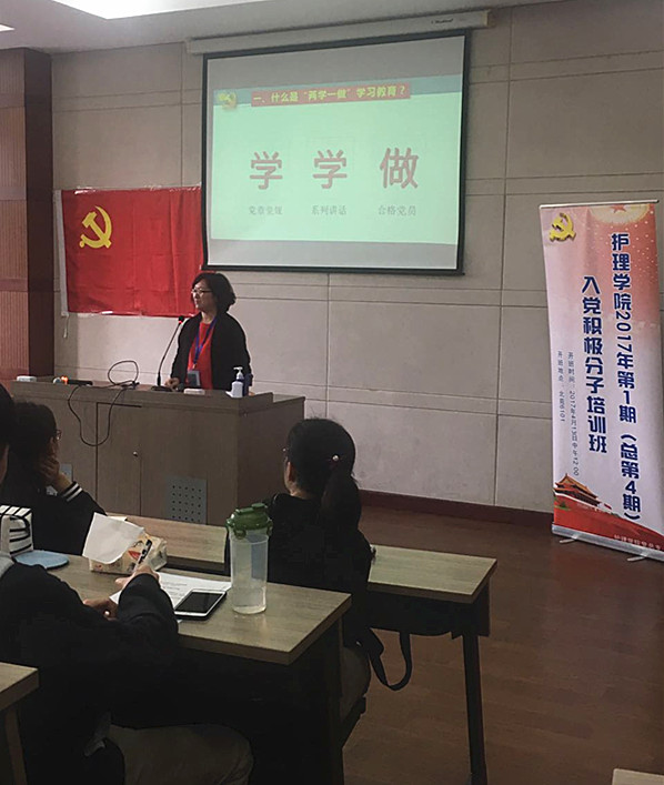4月20日下午,护理学院学生党支部书记方秀琴老师在北苑9号楼的104教室由为学院教师党员代表和入党积极分子培训班学员带来“践行两学一做,带头营造健康网络氛围”的主题讲座。