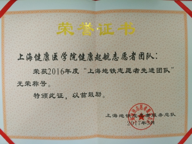 近日,我校护理学院健康起航志愿者团队被上海地铁志愿者服务总队评选为2016年度“上海地铁志愿者先进团队”,成为该志愿者团队成立一年时间内获得的又一项殊荣。