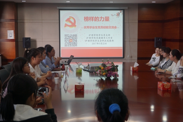 2017年5月22日下午,“榜样的力量”优秀毕业生党员经验交流会在9808教室举办。此次交流会邀请了优秀毕业生党员沈慧婷学姐、余琦玮学姐和潘瑒学姐,护理学院学生党支部书记段慧丹老师、辅导员吉洁老师和李娟娟老师出席本次交流会。